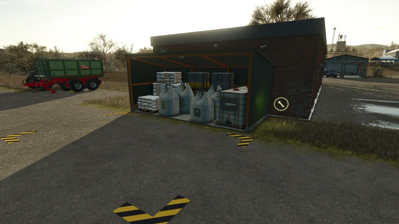 Lagerung von Saatgut, Kalk, Dünger, Herbiziden und Flüssigdünger an einem Ort.