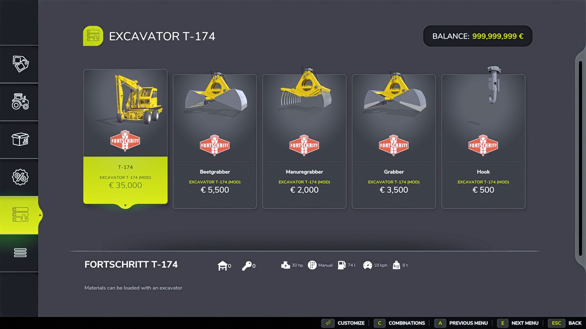 Der FORTSCHRITT T174 kann zum Umschlag von Gütern verwendet werden; es sind Mistgreifer, Rübengreifer, ein Greifer für alle Güter und ein Haken für BigBags erhältlich.