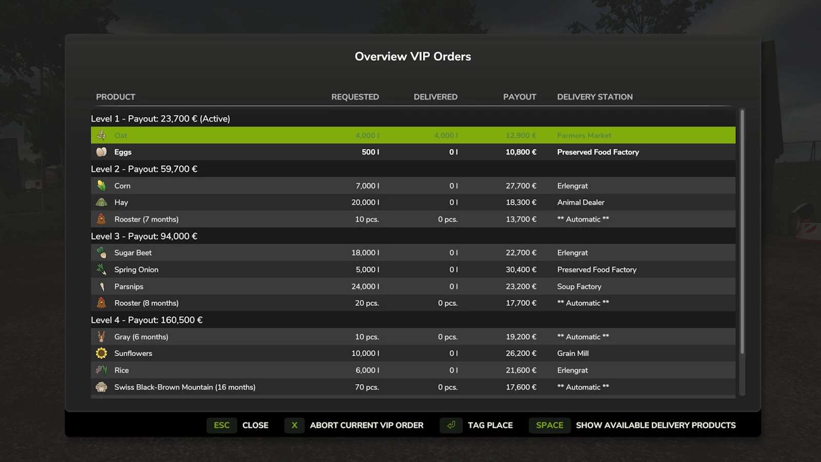 Mit jeder VIP-Bestellung wird das aktuelle Level erhöht, wodurch sich auch die Anzahl der enthaltenen Einzelbestellungen und die zu liefernden Mengen erhöhen und die Einnahmen verringern.