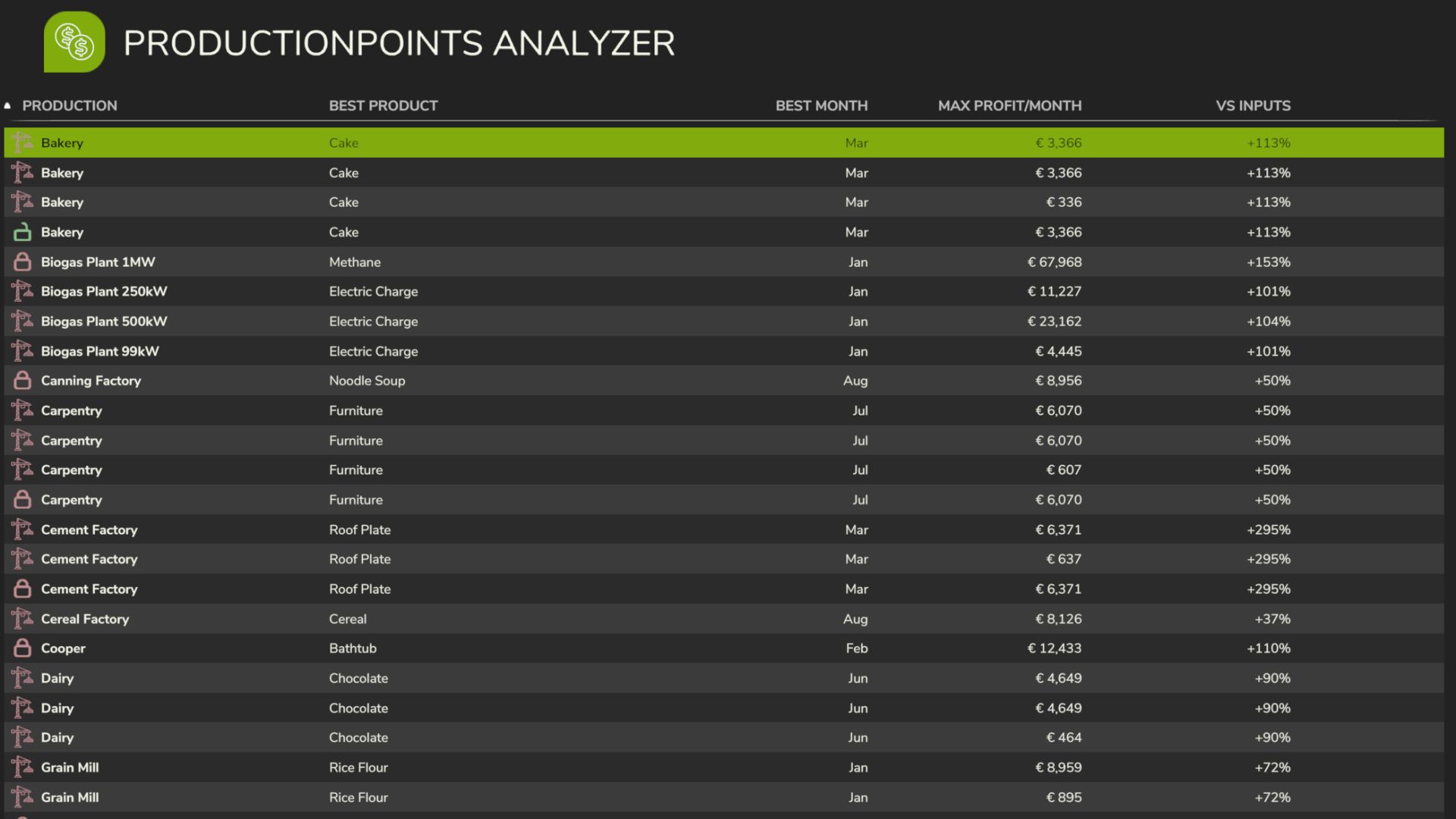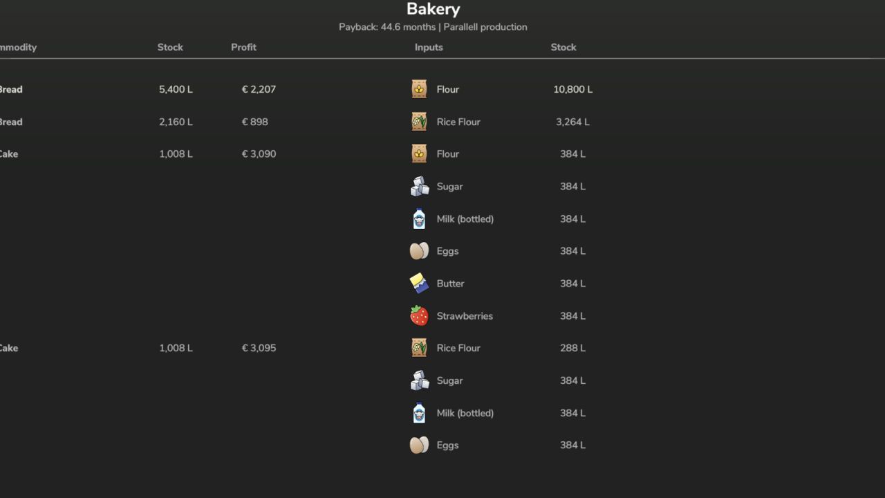 Für jede Produktion bietet die Mod eine detaillierte Wirtschaftlichkeitsanalyse, inklusive des profitabelsten Produkts, des besten Produktionsmonats, des maximal möglichen Gewinns pro Monat und eines direkten Vergleichs zwischen Warenverarbeitung und Rohstoffverkauf. Dadurch wird deutlicher, wo die eigentliche Wertschöpfung stattfindet und wie sich die Produktionsketten im Jahresverlauf entwickeln.