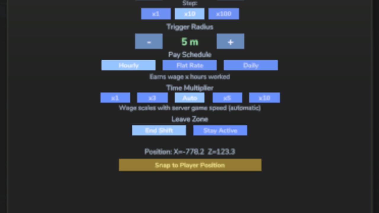 Verwandle jeden beliebigen Ort auf jeder Karte in einen legitimen Arbeitsplatz. Öffne den Arbeitsplatzmanager, füge einen Auslöser hinzu, gib dem Arbeitsplatz einen Namen und einen Lohn, platziere ihn an einer beliebigen Stelle auf der Karte – und schon kannst du ihn betreten und einstempeln. Perfekt für Rollenspieler, die ihrem Farmer einen Nebenjob geben möchten, oder für alle, die ihr Farmeinkommen durch Arbeit außerhalb der Farm aufbessern wollen.