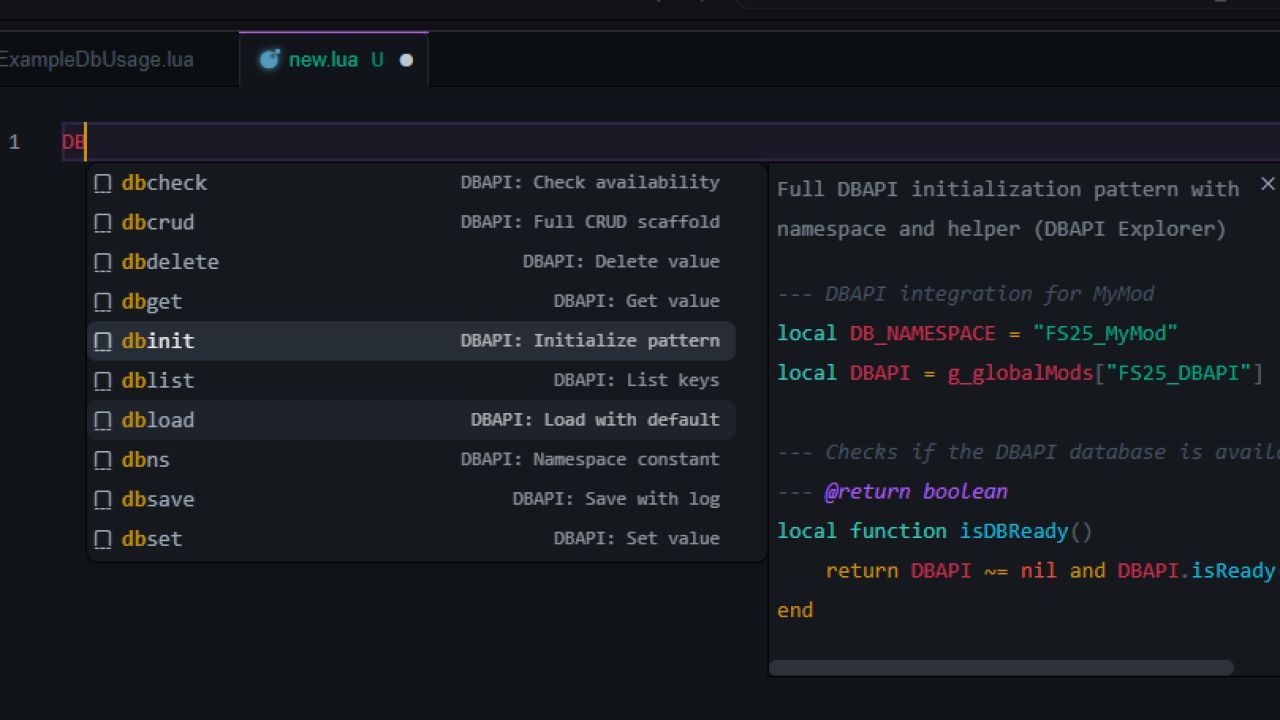 FS25_DBAPI ist eine optimierte Persistenzschicht für Mods des Landwirtschafts-Simulators 25. Sie ersetzt die fragmentierte Datenverarbeitung durch eine zentrale, JSON-basierte FlatDB und bietet eine einfache globale API (g_globalMods["FS25_DBAPI"].DBAPI) für die Speicherung von Schlüssel/Wert-Paaren mit Namensräumen.