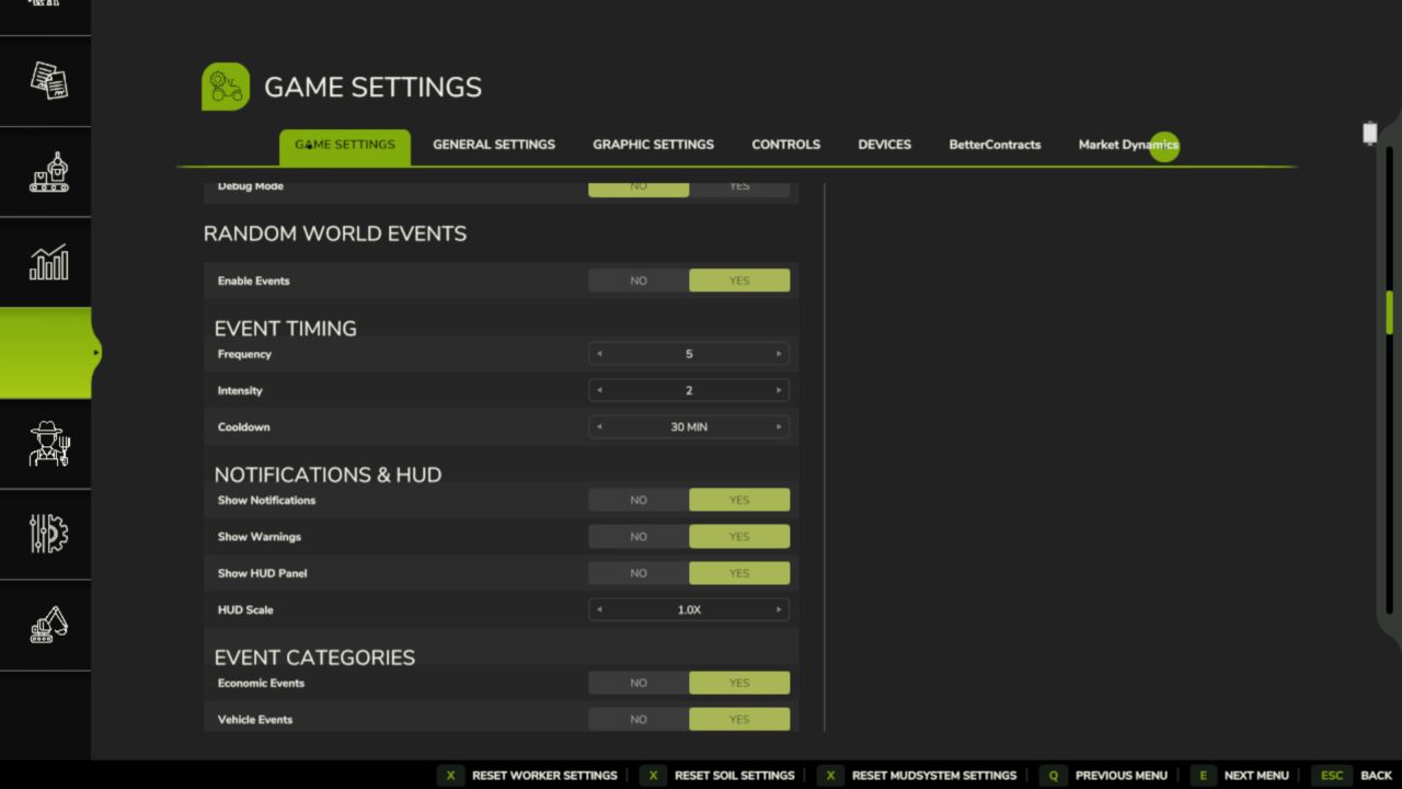 Insgesamt 53 Ereignisse in fünf Kategorien – Wirtschaft (15), Fahrzeuge (8), Feld (10), Spezial (10), Wildtiere (10).